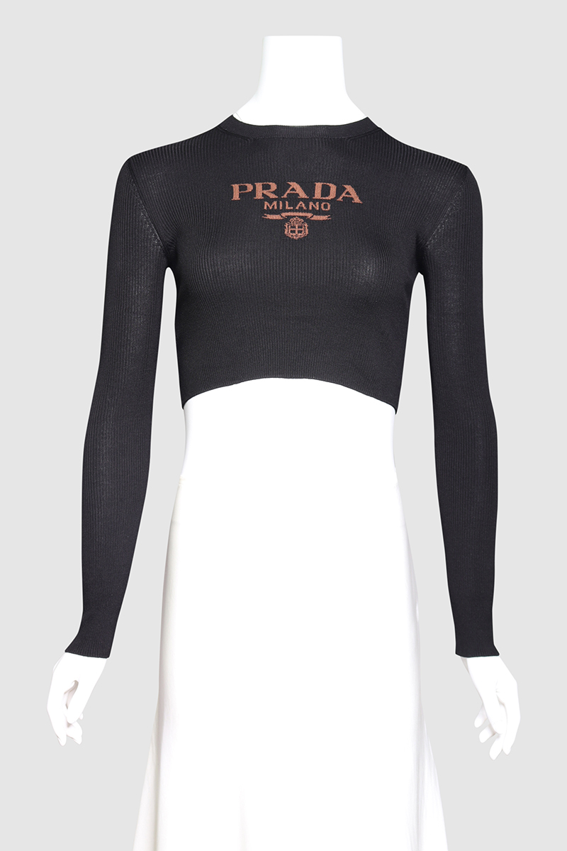 Logo Ribbed Knit Silk Crop TopPrada